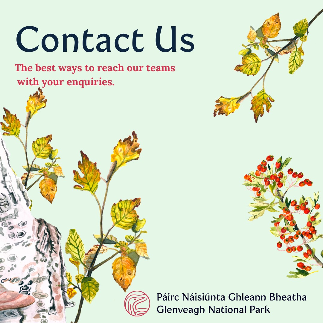 For any nature conservation questions or wildlife crime reporting, contact the Park Ranger team at glenveaghrangers@npws.gov.ie .