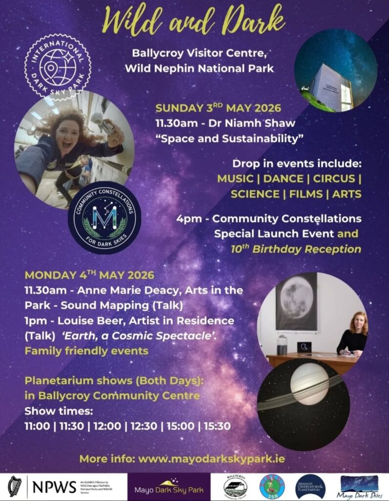 On Sunday the 3rd, join us in the Ballycroy Visitor Centre from 11am where Dr. Niamh Shaw will give a talk on “Space and Sustainability”